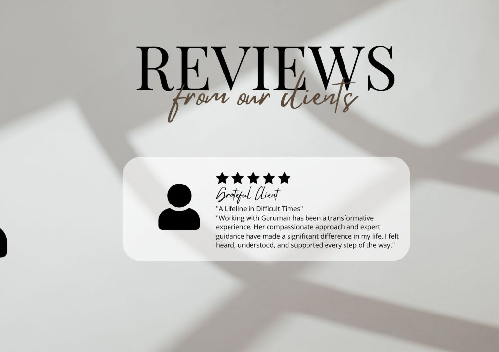 “Working with Guruman has been a transformative experience. Her compassionate approach and expert guidance have made a significant difference in my life.” – A Satisfied Client